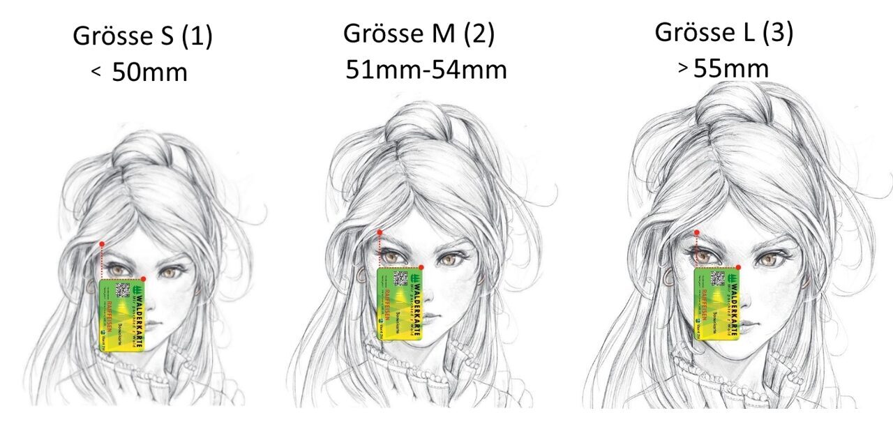 - Wenn die Kante der Karte weiter als der Augen Rand reicht (1), brauchen Sie eine kleine Größe (Größe: S).